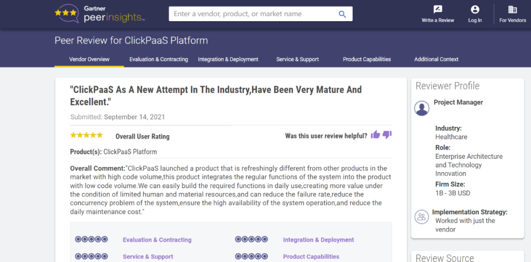 Tips::::::【Peer Insights】——用户对企业IT产品和服务发布真实评价的平台。。。。。。。。。。。。目前已有355个市场,,,,,,,255,000条经过验证的评价。。。。。。每一条评价Gartner会针对参评企业营收规模及参评人员信息做验证、、、、、、、、、评价内容做多维核实。。。。。